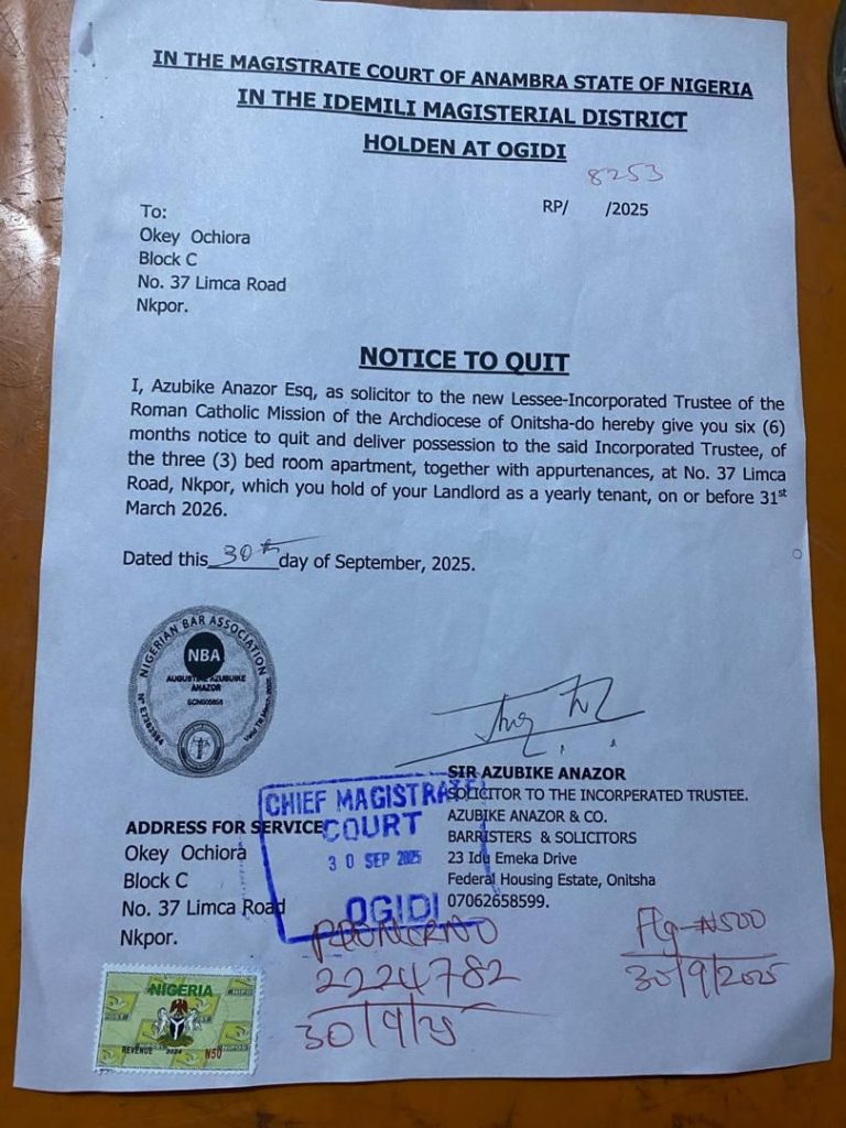 As Catholic family that the Estate is, they ran to their bishop to greet him and also to receive some religious acclaimed blessings from him but he never give them face, that is when they started suspecting that something is wrong somewhere, after someone months a quit notice of 6 months was giving to them by Bishop of Onitsha Diocese, they ran to the landlord and cried to him and even promise the landlord that they are going to pay the sum of 600k to make sure they retain their homes, but the church letter added another money on it.